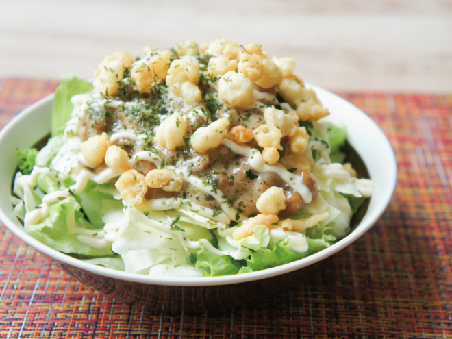 えび天かす青のり燻製マヨ納豆サラダの作り方