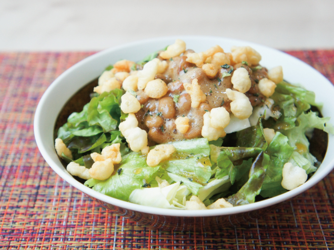 わさび納豆えび天かすサラダ 材料納豆(丹念納豆)、レタス、キャベツ、えび天かす、わさびふりかけ、オニオンドレッシングわさび納豆えび天かすサラダの作り方①レタスとキャベツは、食べやすい大きさに切ったら、器に盛りつけます。②よく混ぜた納豆をかけたら、オニオンドレッシングをかけます。③えび天かすを散らしたら、わさびふりかけをかけて完成です。