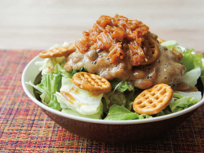 旨辛なめ茸納豆プレッツェルサラダ 材料納豆(丹念納豆)、レタス、キャベツ、ブロッコリースプラウト、プレッツェル、旨辛なめ茸、オニオンドレッシング旨辛なめ茸納豆プレッツェルサラダの作り方①レタス、キャベツ、ブロッコリースプラウトは、食べやすい大きさに切ったら、器に盛りつけます。②よく混ぜた納豆をかけたら、オニオンドレッシングをかけます。③プレッツェルを盛り付けて、旨辛なめ茸をかけたら完成です。