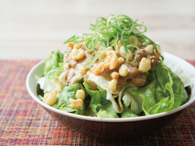 納豆(丹念納豆)、レタス、キャベツ、ブロッコリースプラウト、えび天かす、ねぎ、ごま、オニオンドレッシング