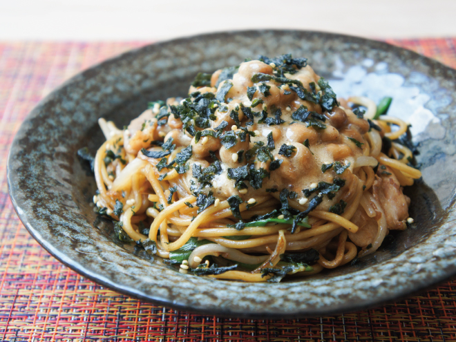 韓国のり納豆焼きそば 材料納豆(丹念納豆)、豚肉、にら、もやし、焼きそばの麺、焼きそばの素、韓国のり韓国のり納豆焼きそばの作り方①豚肉を炒めたら、もやしとにらを炒めます。②焼きそば麺、焼きそばの素を入れたら、なじませ炒めます。③焼きそばを盛り付けたら、納豆をのせて、韓国のりをかけたら完成です。