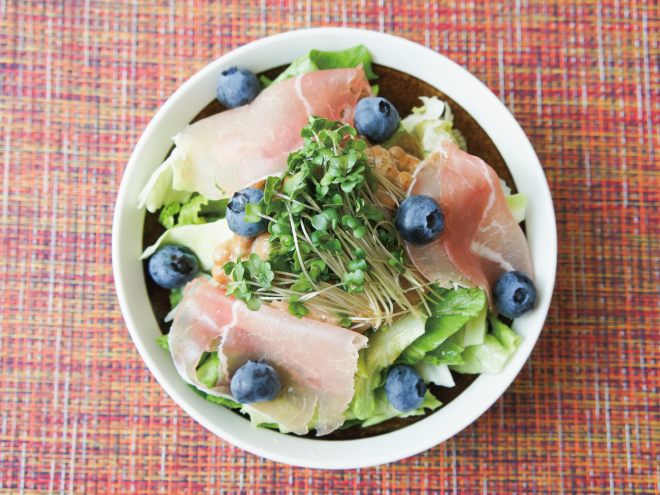 納豆(丹念納豆)、レタス、キャベツ、ブロッコリースプラウト、生ハム、ブルーベリー、オニオンドレッシング