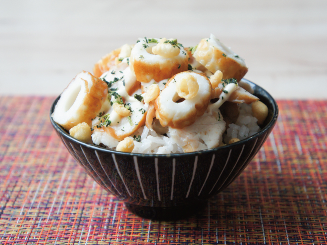 スモークチキンえび天かすわさびマヨ竹輪納豆麦ごはん 材料納豆(丹念納豆)、スモークチキンサラダ、ちくわ、えび天かす、わさびふりかけ、マヨネーズ、麦ご飯スモークチキンえび天かすわさびマヨ竹輪納豆麦ごはんの作り方①お茶碗に麦ごはんをついだら、よく混ぜた納豆をかけます。②スモークチキンサラダをのせたら、マヨネーズをかけます。③ちくわを盛りつけ、えび天かす、わさびふりかけをかけたら完成です。