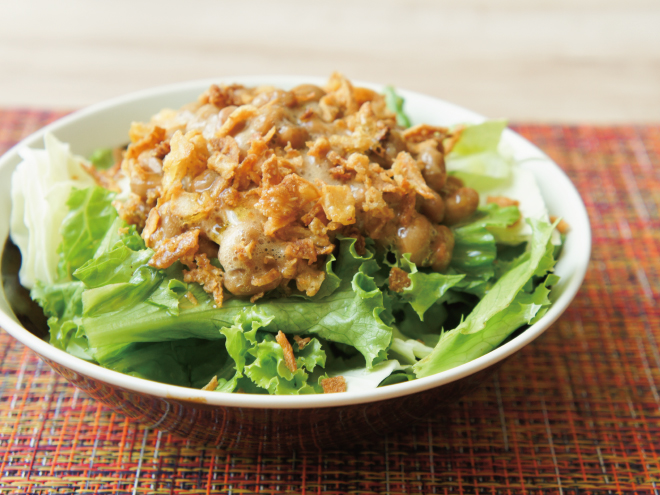 オリーブわさび塩納豆フライドオニオンサラダ 材料納豆(丹念納豆)、レタス、キャベツ、フライドオニオン、わさび塩、オリーブオイルオリーブわさび塩納豆フライドオニオンサラダの作り方①レタスとキャベツは、食べやすい大きさに切ったら、器に盛りつけます。②よく混ぜた納豆をかけたら、フライドオニオンをかけます。③オリーブオイル、わさび塩をかけたら完成です。