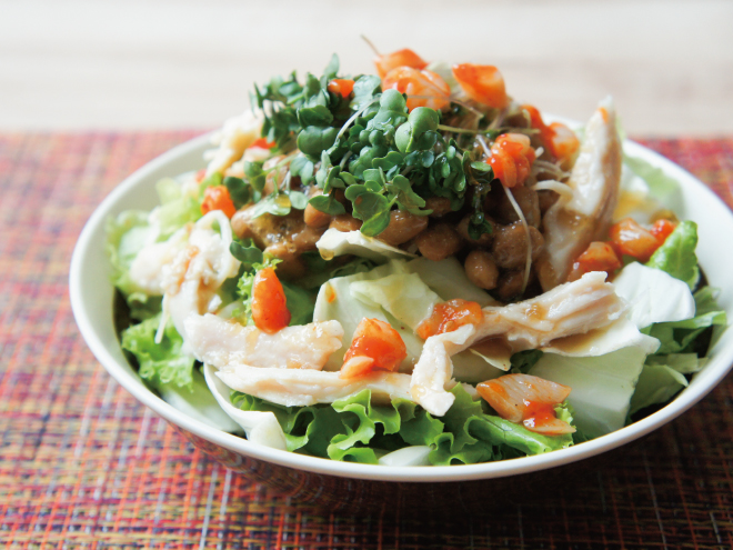 つぶ貝チャンジャ蒸し鶏おろし大根納豆ブロッコリースプラウトサラダ 材料納豆(丹念納豆)、レタス、キャベツ、ブロッコリースプラウト、蒸し鶏、つぶ貝チャンジャ、大根おろしドレッシングつぶ貝チャンジャ蒸し鶏おろし大根納豆ブロッコリースプラウトサラダの作り方①レタス、キャベツは、食べやすい大きさに切ったら、器に盛りつけます。②よく混ぜた納豆をかけたら、ブロッコリースプラウトをのせます。③蒸し鶏、つぶ貝チャンジャを盛り付けて、大根おろしドレッシングをかけたら完成です。