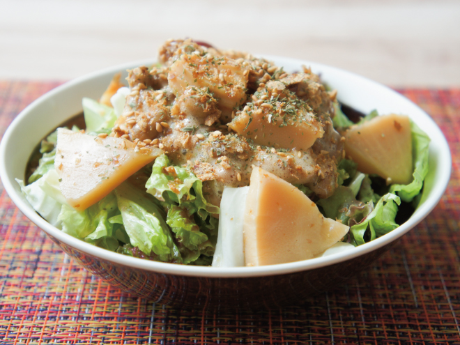 納豆(丹念納豆)、レタス、キャベツ、たけのこ土佐煮、かつおチーズふりかけ、ごま、パセリ、オリーブオイル