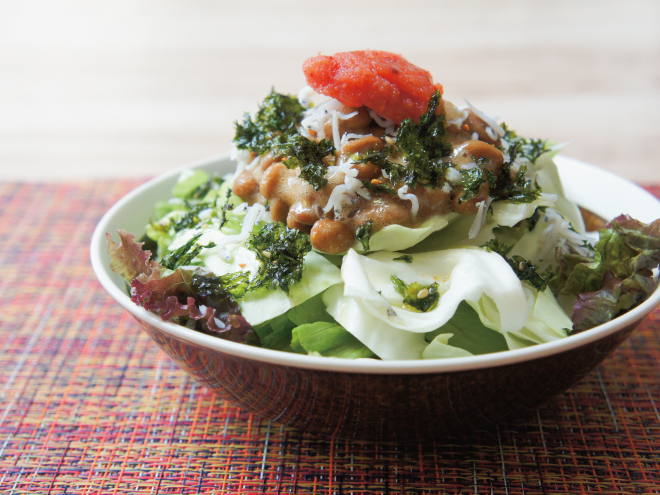 納豆(丹念納豆)、レタス、キャベツ、ちりめんじゃこ、明太子、韓国のり、島みかんスパイス、オリーブオイル