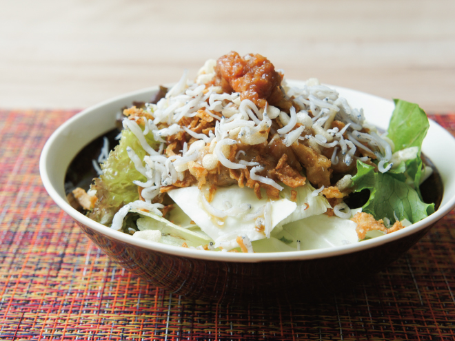 天かすジャコもろみ納豆フライドオニオンサラダ 材料納豆(丹念納豆)、レタス、キャベツ、フライドオニオン、天かす、ちりめんじゃこ、もろみ、ゆずドレッシング天かすジャコもろみ納豆フライドオニオンサラダの作り方①レタスとキャベツは、食べやすい大きさに切ったら、器に盛りつけます。②よく混ぜた納豆をかけたら、フライドオニオン、天かす、ゆずドレッシングをかけます。③もろみをのせて、ちりめんじゃこをかけたら完成です。