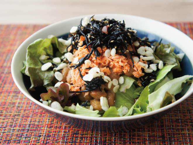 天かす梅ひじき鮭納豆サラダ 材料納豆(丹念納豆)、レタス、キャベツ、シャケフレーク、梅ひじき、天かす天かす梅ひじき鮭納豆サラダの作り方①レタスとキャベツは、食べやすい大きさに切ったら、器に盛りつけます。②よく混ぜた納豆をかけたら、鮭フレークをかけます。③梅ひじきをのせて、天かすをかけたら完成です。