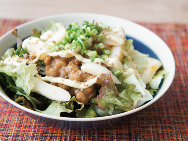 チーズ笹かまネギごま納豆マヨサラダ 材料納豆(丹念納豆)、レタス、キャベツ、ブロッコリースプラウト、チーズ笹かま、ねぎ、すりごま、マヨネーズチーズ笹かまネギごま納豆マヨサラダの作り方①レタス、キャベツ、ブロッコリースプラウトは、食べやすい大きさに切ったら、器に盛りつけます。②よく混ぜた納豆をかけたら、切ったチーズ笹かまをのせます。③ねぎ、すりごま、マヨネーズをかけたら完成です。
