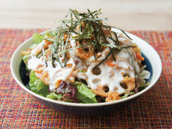 海苔れんこんフライドオニオン納豆スモークシーザーサラダ 材料納豆(丹念納豆)、レタス、キャベツ、ブロッコリースプラウト、れんこんの煮物、フライドオニオン、刻みのり、スモークシーザードレッシング海苔れんこんフライドオニオン納豆スモークシーザーサラダの作り方①レタス、キャベツ、ブロッコリースプラウトは、食べやすい大きさに切ったら、器に盛りつけます。②よく混ぜた納豆をかけたら、レンコンを盛りつけます。③フライドオニオン、スモークシーザードレッシング、刻みのりをかけたら完成です。