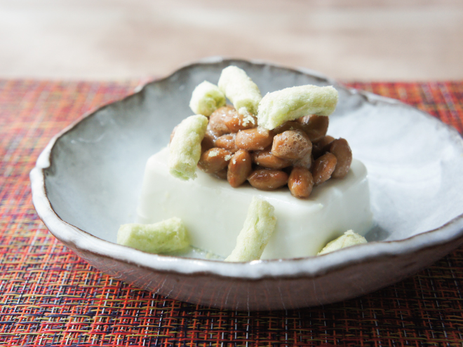 えだまめスナック納豆えだまめ豆腐 材料納豆(丹念納豆)、えだまめスナック、えだまめ豆腐えだまめスナック納豆えだまめ豆腐の作り方①えだまめ豆腐を盛りつけたら、よく混ぜた納豆をかけます。②えだまめスナックをのせて完成です。