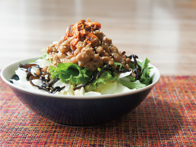 食べるラー油しそ昆布納豆和風サラダ 材料納豆(丹念納豆)、レタス、キャベツ、いりごま、食べるラー油、しそ昆布の佃煮、和風ドレッシング食べるラー油しそ昆布納豆和風サラダの作り方①レタスとキャベツは、食べやすい大きさに切ったら、器に盛りつけます。②納豆をのせたら、和風ドレッシングをかけます。③しそ昆布の佃煮を盛り付けて、いりごま、食べるラー油をかけたら完成です。