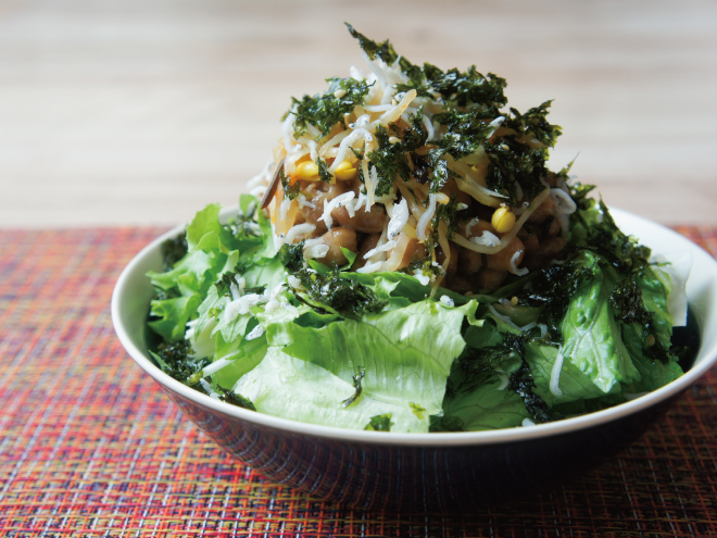 韓国のりナムルじゃこ納豆サラダ 材料納豆(丹念納豆)、レタス、キャベツ、ナムル、ちりめんじゃこ、韓国のり韓国のりナムルじゃこ納豆サラダの作り方①レタスとキャベツは、食べやすい大きさに切ったら、器に盛りつけます。②納豆をのせたら、ナムルをのせます。③ちりめんじゃこ、韓国のりをかけたら完成です。