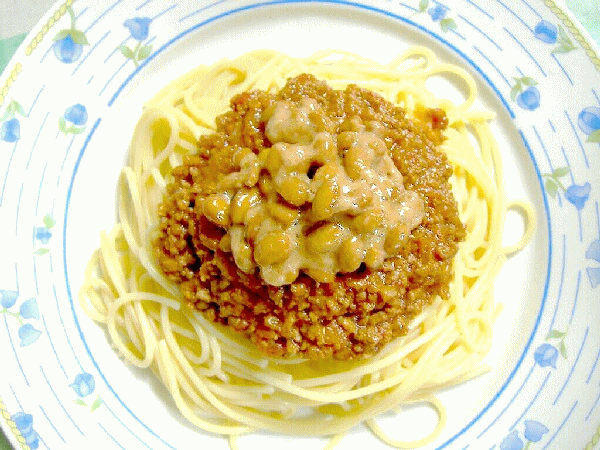 手作り丼納豆(中粒)、にんにく(1かけら)、玉ねぎ(1玉)、ひき肉(320g)、ホールトマト缶詰(1缶)、オリーブ油、ドミグラスソース缶詰(半分以上)、塩、スパゲティ(400g)