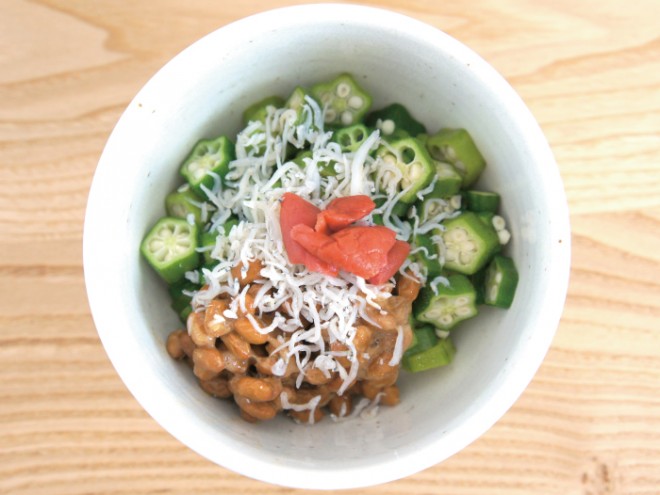 ③納豆、ちりめん、梅をおくらといっしょによく混ぜて完成です。