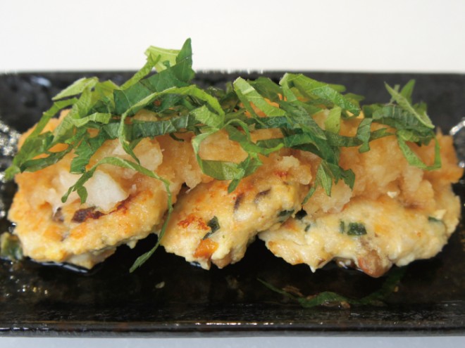 ④焼き上げたら、皿に盛り大根おろしをかけ切ったしそをのせポン酢をかけて完成です。