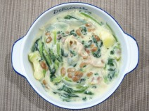 納豆、ほうれんそう、たまねぎ、じゃがいも、豚肉、小麦粉、牛乳、コンソメ、、塩、コショウ、バター、粉チーズ
