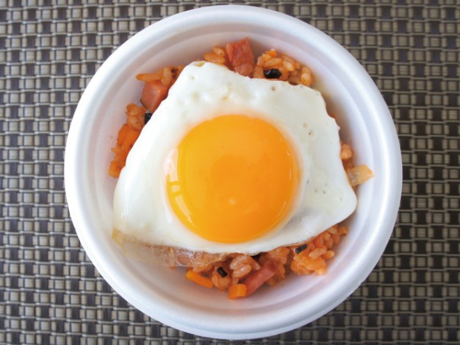 ②次に納豆の上にケチャップライス、目玉焼きをのせ、納豆のタレで混ぜ合わせて完成です。