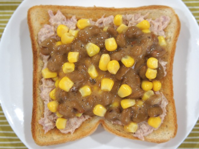 ②そして食パンを焼いたら、①をのせ、納豆とコーンをかけたら完成です。
