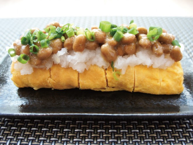 ④そして、その上に大根おろしと混ぜた納豆をのせ、しょうゆをかけたら完成です。