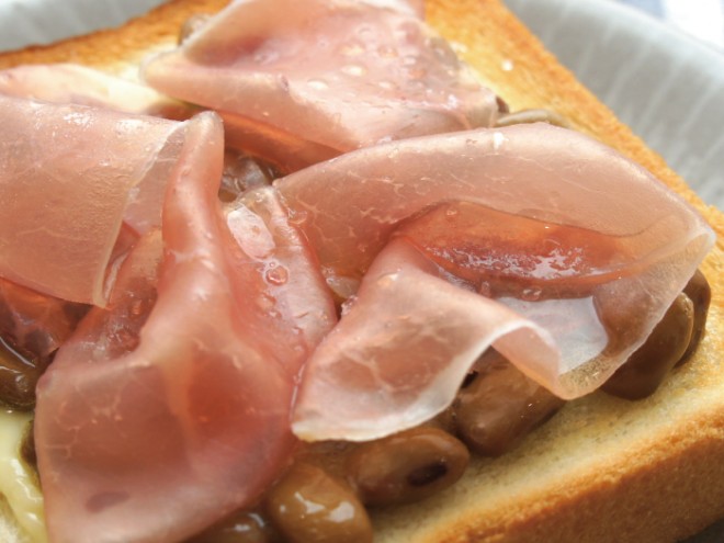 ②次に焼いたトーストにタレを混ぜた納豆をかけ、生ハムをのせます。