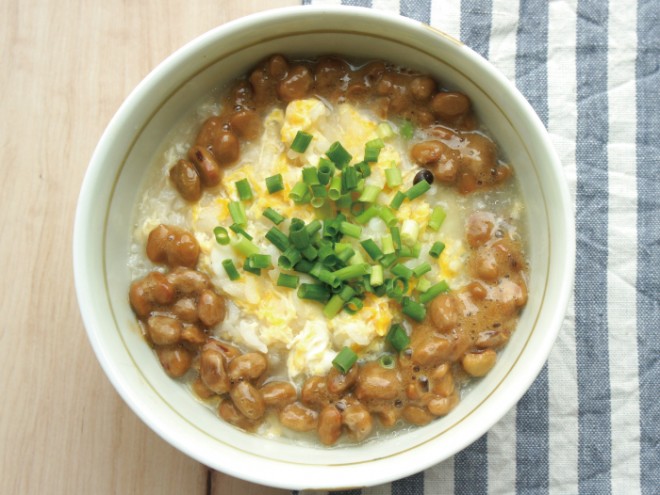 納豆(丹念納豆)、ご飯、卵、ネギ、鍋のあとの汁