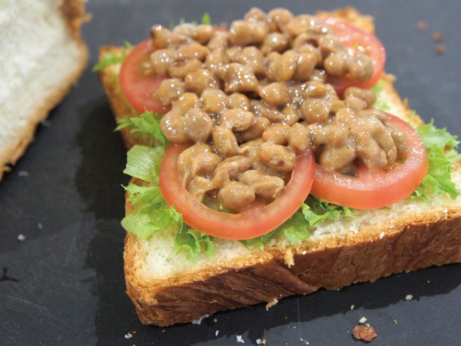 納豆(丹念納豆)、えごま油、トマト、フリルレタス、デニッシュパン