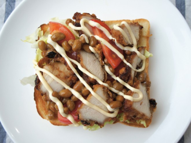 納豆(高千穂納豆)、食パン、からあげ、チーズ、レタス、トマト、マヨネーズ