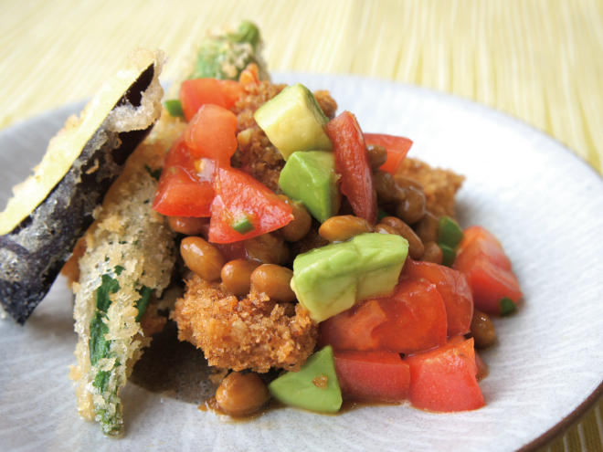 納豆(高千穂納豆)、白身魚、トマト、アボカド、ナス、オクラ、小麦粉、水、パン粉、塩コショウ