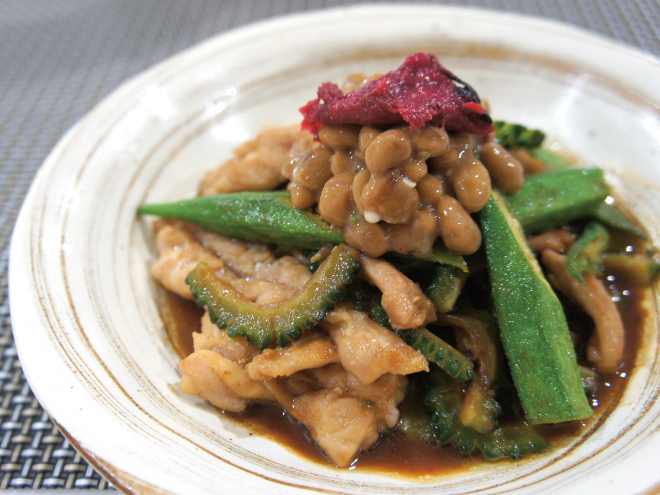 納豆(高千穂納豆)、鶏せせり、ゴーヤ、梅干し、焼肉のタレ