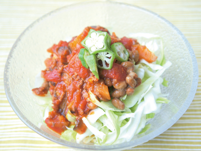 ④キャベツ、レタスを千切りにして、器に盛り付け、出来上がったミートソースをかけ納豆とオクラをのせたら出来上がりです。