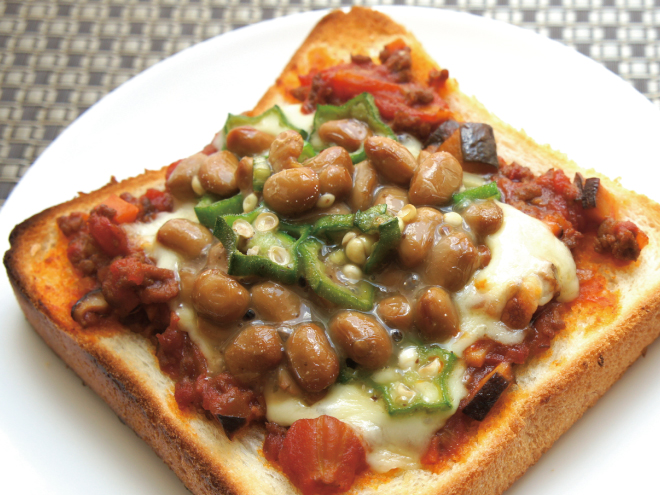 ④食パンに、出来上がったミートソースをかけチーズ、納豆、オクラをのせて焼き上げたら出来上がりです。
