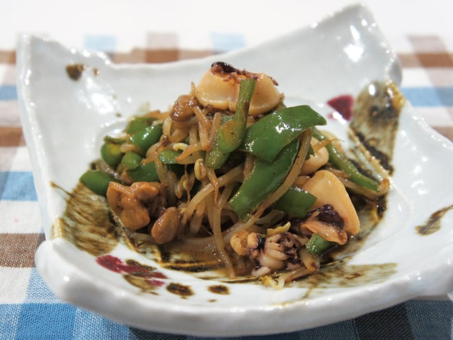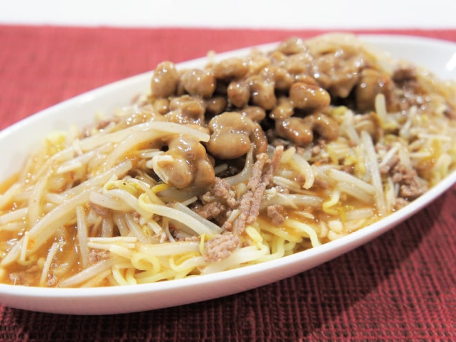 納豆(丹念納豆)、もやし、ピーマン、厚揚げ、黒擦りゴマ、中華ダシ、醤油、粗びき塩コショウ