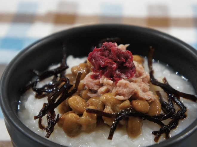 納豆(丹念納豆)、春菊、えのき、しめじ、ベーコン、梅干し、だしの素、醤油、ごま油