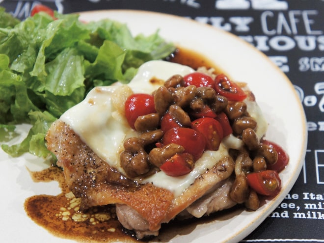 納豆(丹念納豆)、鶏もも肉、茄子、にんにく、バルサミコ酢、醤油、オリーブオイル、塩、粗びき塩コショウ