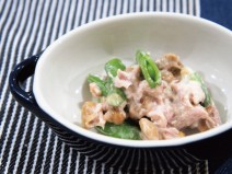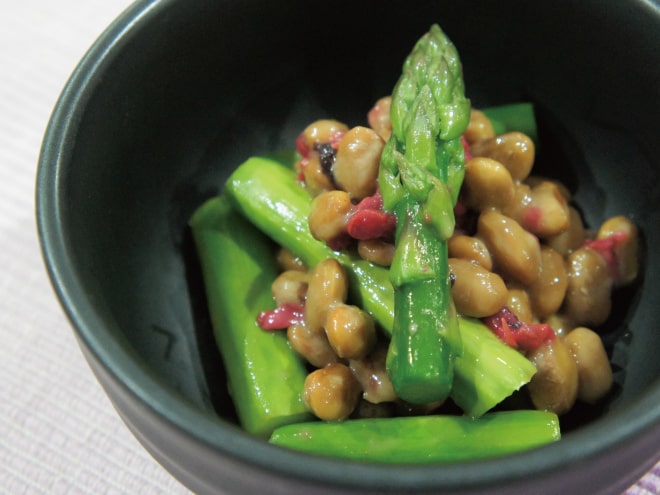 ひきわり納豆、スナップえんどう、生わかめ、ちりめんじゃこ、ポン酢、オリーブオイル、塩