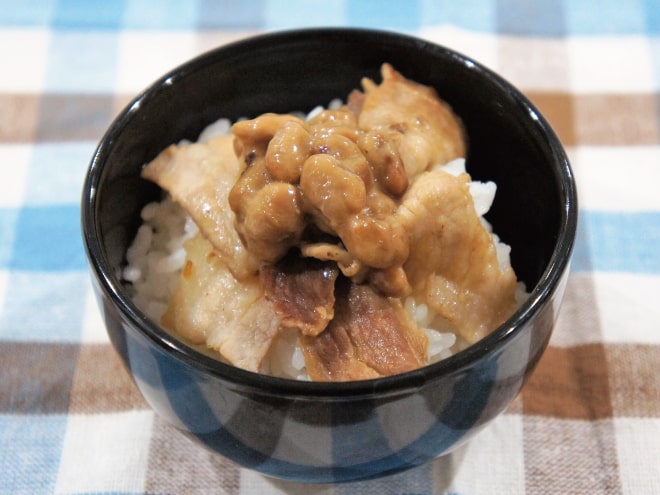 納豆(丹念納豆)、豚バラしゃぶしゃぶ用肉、玉ねぎ、焼き肉のタレ、白米、ゆで卵