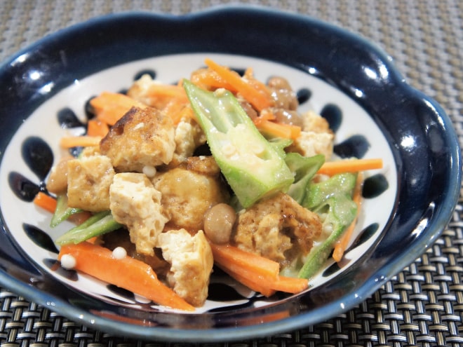 ひき割り納豆、厚揚げ、白ネギ、人参、しめじ、オイスターソース