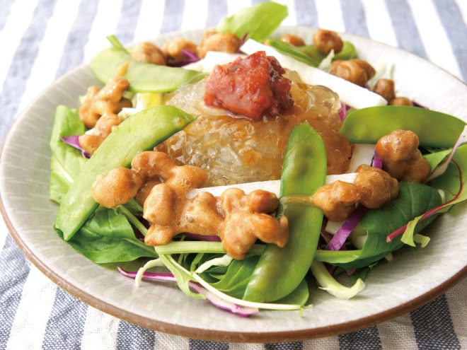 きぬさやと紫キャベツサラダの納豆ところてん